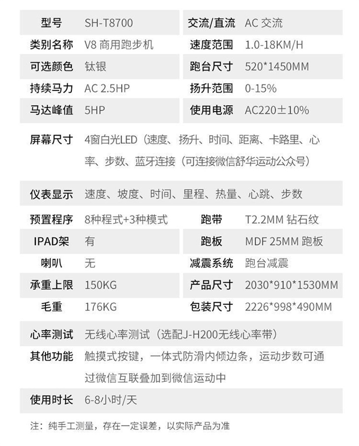 • 产品简介:舒华商用跑步机SH-T8700(Sv8)室内健身房健身器材